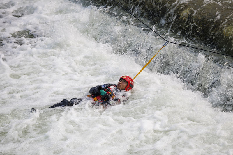 “沸腾线”又被称为“死亡线”,横在河面上的简易拦水坝被称为“滚水坝”,而坝体高度差形成的冲击使水流像沸腾了一样上下翻腾,被称为“沸腾线”,人一旦靠近,上层水流会如滚筒洗衣机一般把人卷入难以脱身。现场消防员演示时,即使他割开保护环穿着救生衣拼命向下游游动,但最后依旧会被冲到沸腾线附近。