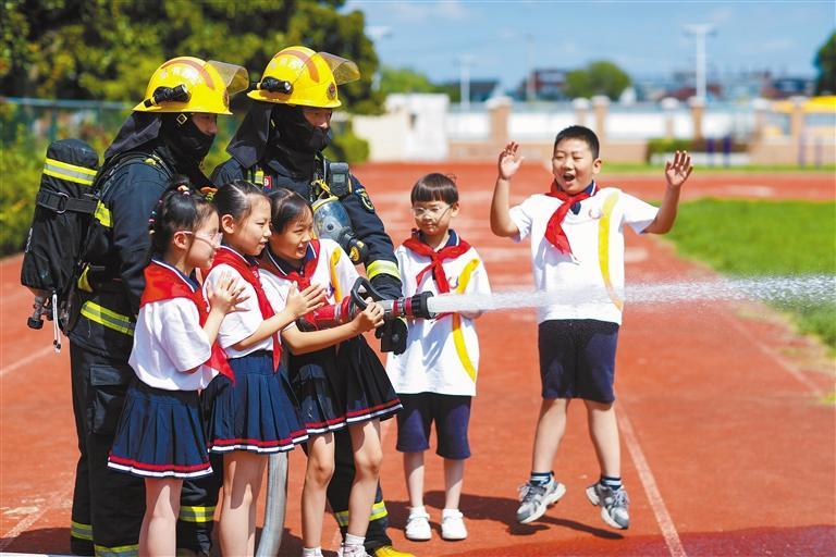 这是在兴化市陈堡中心小学,兴化市消防救援大队消防员辅助学生进行消防水枪的喷水体验。