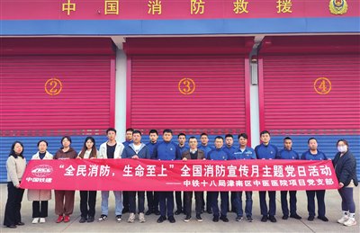 近日,中铁十八局津南区中医院项目部开展了“全民消防,生命至上”全国消防宣传月主题党日活动。项目部党支部走进津南区津沽路消防救援站进行现场观摩,并参与了消防安全知识讲座。通过活动,进一步增强了党员干部的消防安全意识,提升了火灾防控能力。