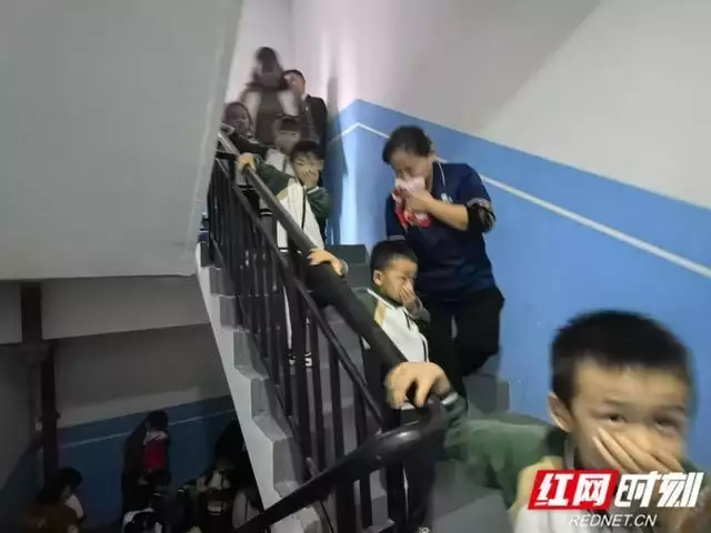 参与消防演习的小朋友们手捂住鼻,弯下腰逐一从消防通道出门。