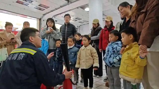 孩子们围着消防员,认真地听着消防员介绍灭火器、逃生绳的用法,并不时向消防员提问,了解消防员出警救援的日常。