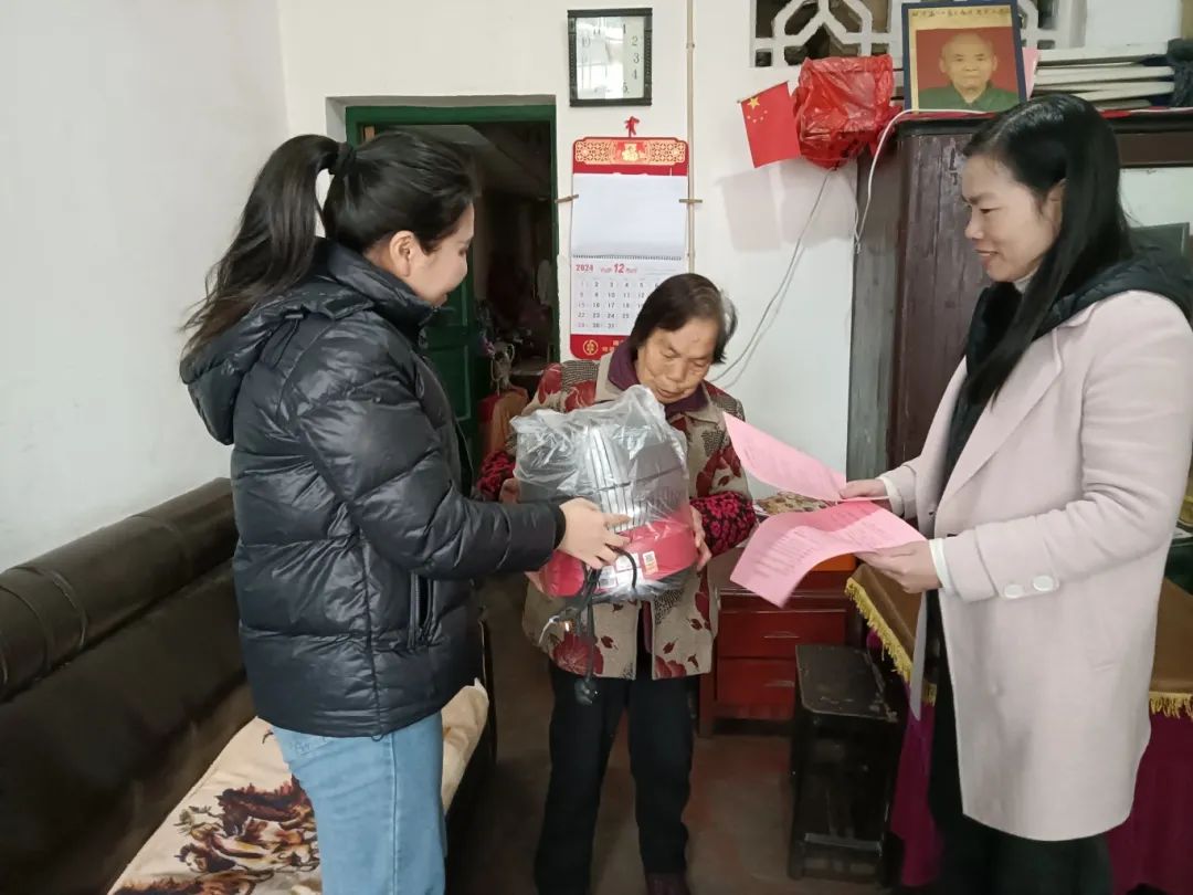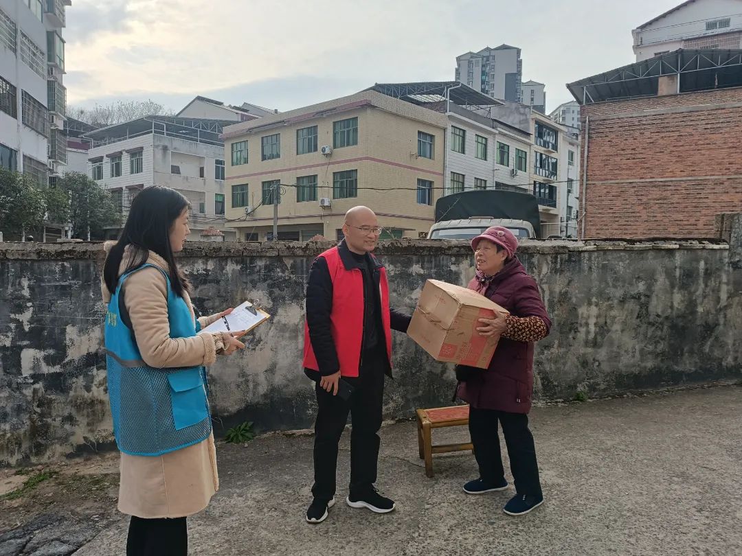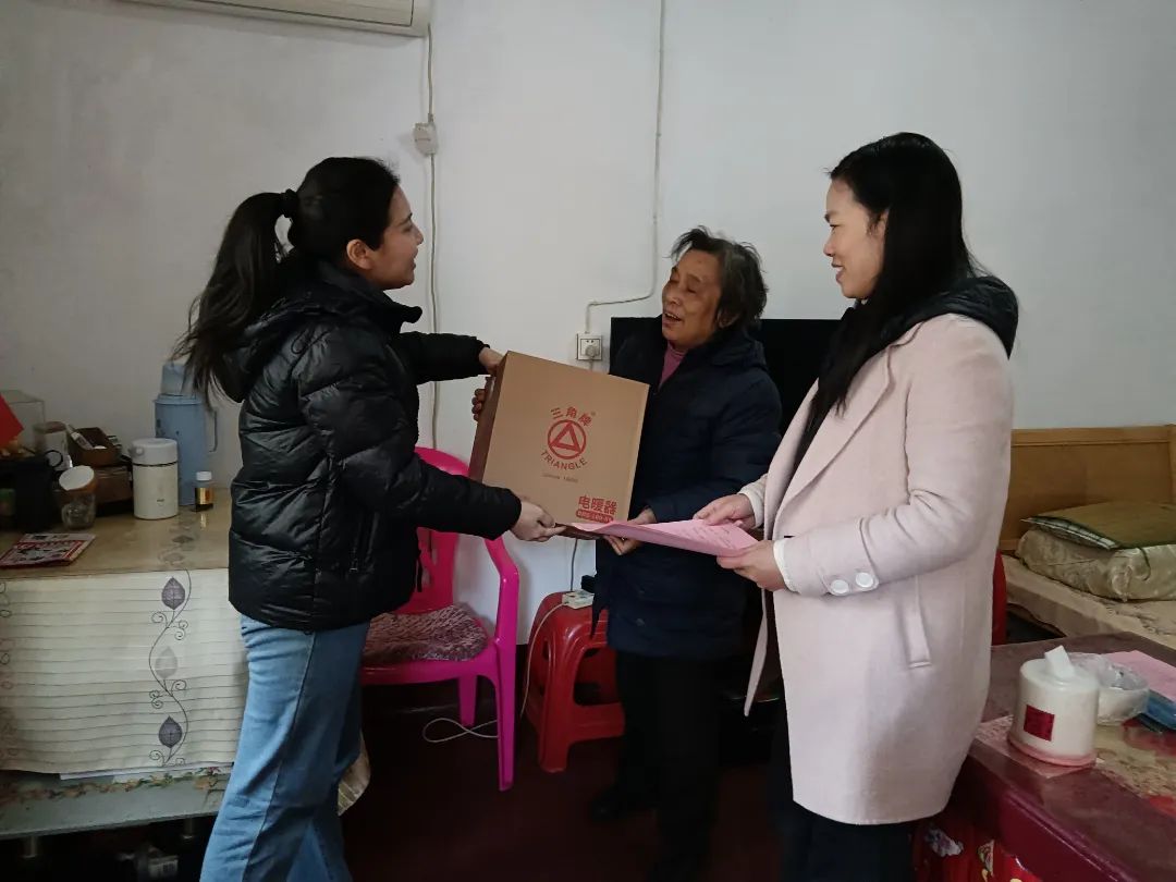 12月19日,衡阳市南岳区岳庙社区86岁的独居孤寡老人蒋菊英接过社区工作人员送来的取暖器连声道谢。